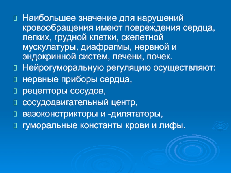 Слайд 14Наибольшее значение для нарушений кровообращения имеют повреждения сердца, легких, грудной
