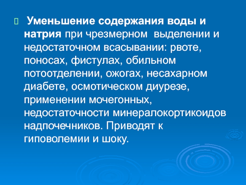 Слайд 7 Уменьшение содержания воды и натрия при чрезмерном выделении и