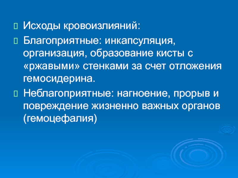 Благоприятные: инкапсуляция, организация, образование кисты с «ржавыми» стенками за