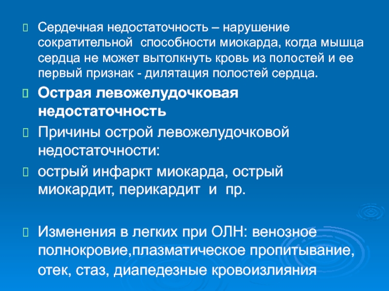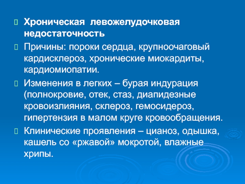 Причины: пороки сердца, крупноочаговый кардисклероз, хронические миокардиты, кардиомиопатии.