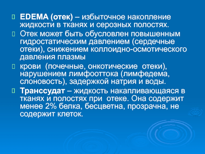 Слайд 12EDEMA (отек) – избыточное накопление жидкости в тканях и серозных