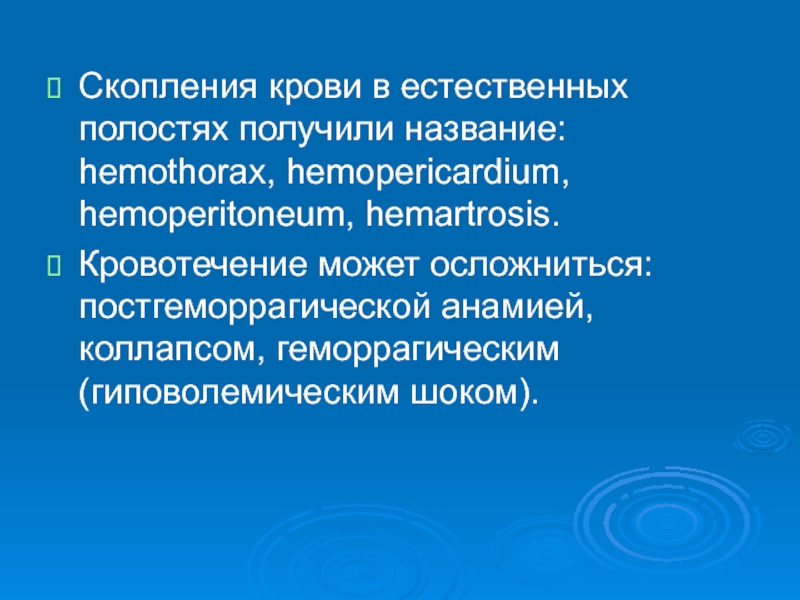 Слайд 40Скопления крови в естественных полостях получили название: hemothorax, hemopericardium, hemoperitoneum,