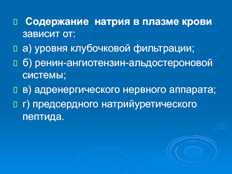 Слайд 6 Содержание натрия в плазме крови зависит от: