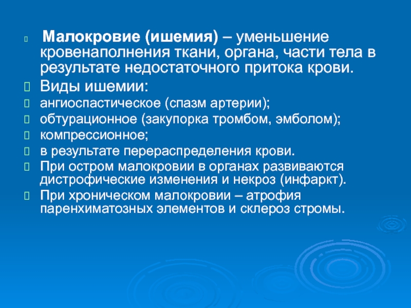 Слайд 36 Малокровие (ишемия) – уменьшение кровенаполнения ткани, органа, части тела