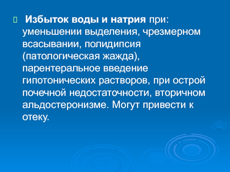 Слайд 8 Избыток воды и натрия при: уменьшении выделения, чрезмерном всасывании,