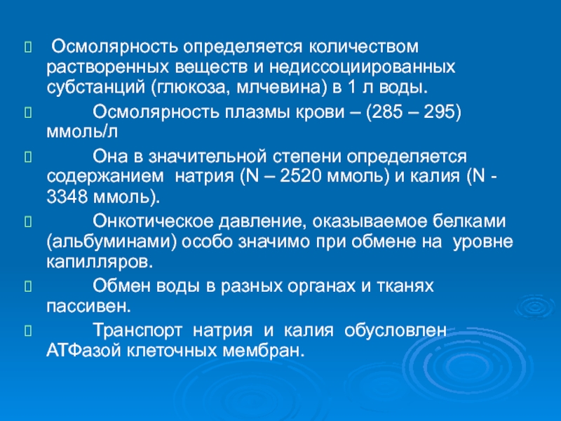 Слайд 4 Осмолярность определяется количеством растворенных веществ и недиссоциированных субстанций (глюкоза,