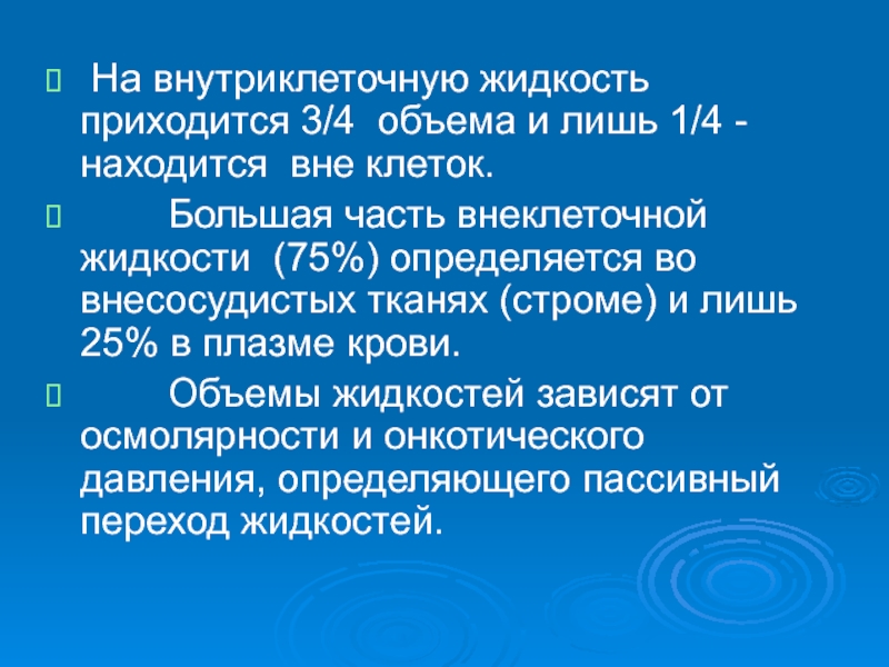 Слайд 3 На внутриклеточную жидкость приходится 3/4 объема и лишь 1/4