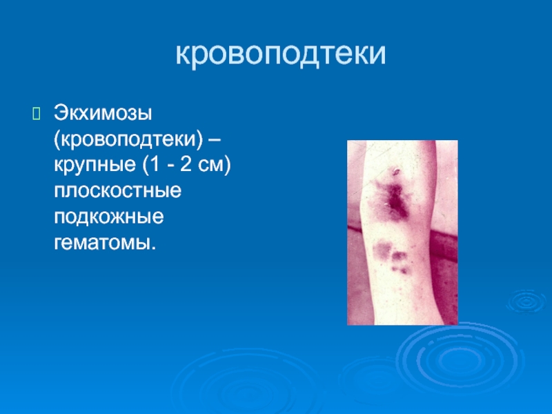 Экхимозы (кровоподтеки) – крупные (1 - 2 см) плоскостные подкожные