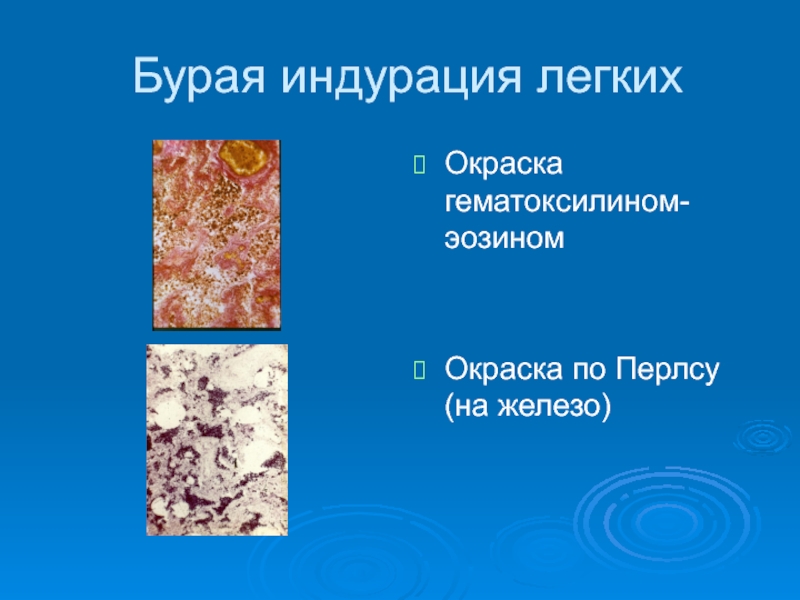 в легких – бурая индурация (полнокровие, отек, стаз, диапидезные кровоизлияния,