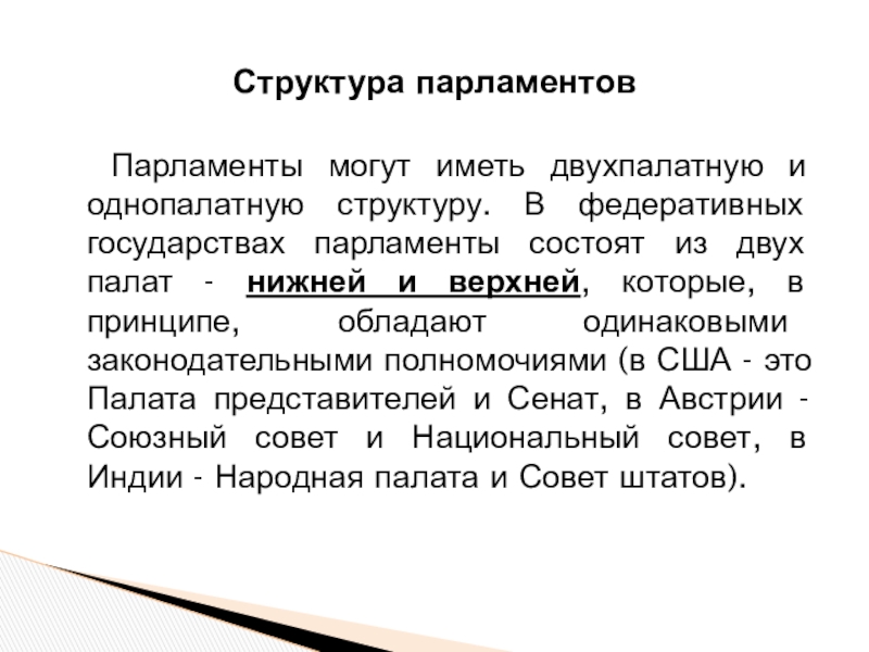 Слайд 11Парламенты могут иметь двухпалатную и однопалатную структуру. В федеративных государствах