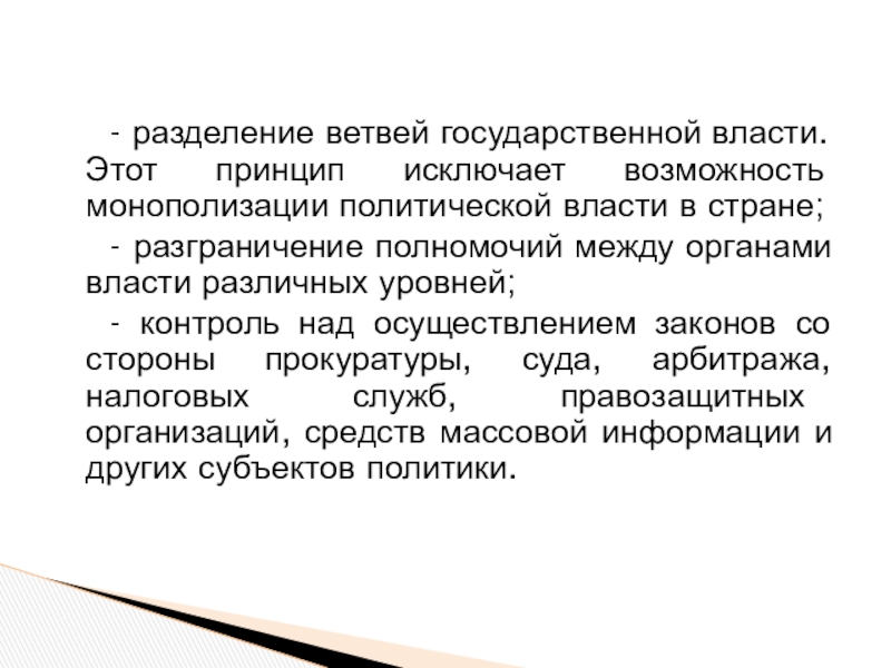 Слайд 25- разделение ветвей государственной власти. Этот принцип исключает возможность монополизации