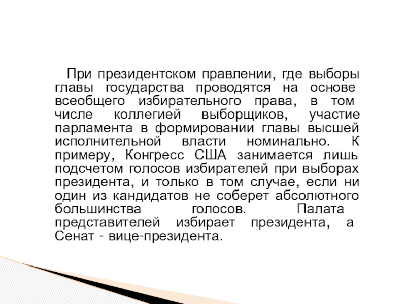 Слайд 15При президентском правлении, где выборы главы государства проводятся на основе