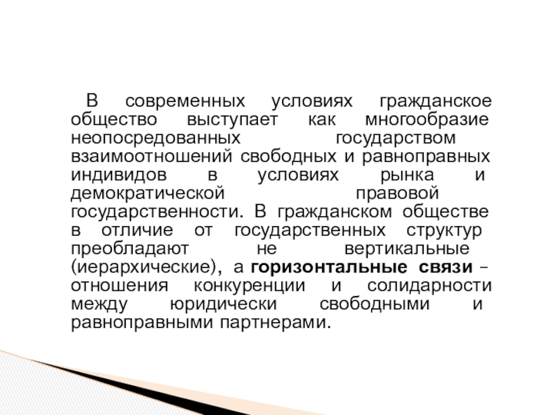 правовой государственности. В гражданском обществе в отличие от государственных структур преобладают не вертикальные (иерархические), а горизонтальные связи – отношения конкуренции и солидарности между юридически свободными и равноправными партнерами.