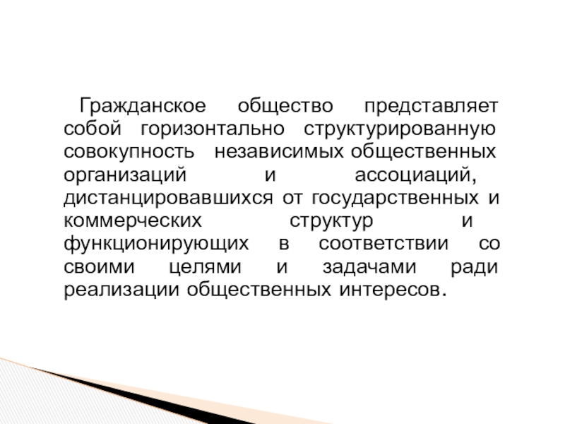 Слайд 34Гражданское общество представляет собой горизонтально структурированную совокупность независимых общественных организаций и