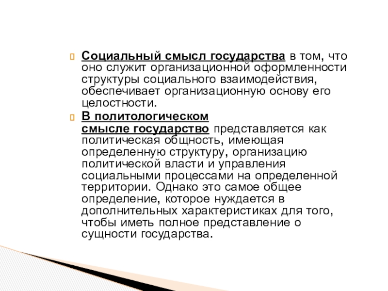 Слайд 5Социальный смысл государства в том, что оно служит организационной оформленности структуры