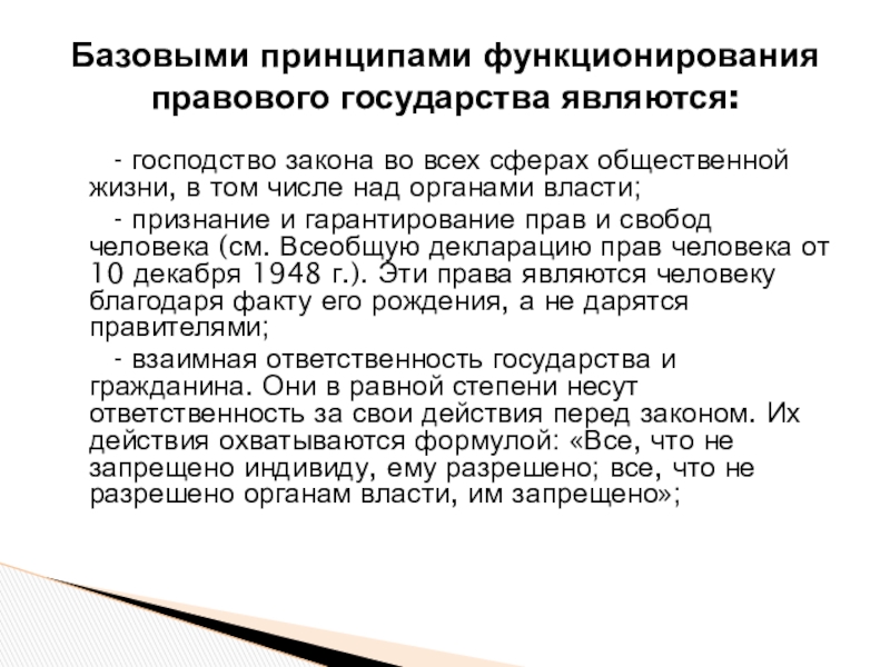 Базовыми принципами функционирования правового государства являются: