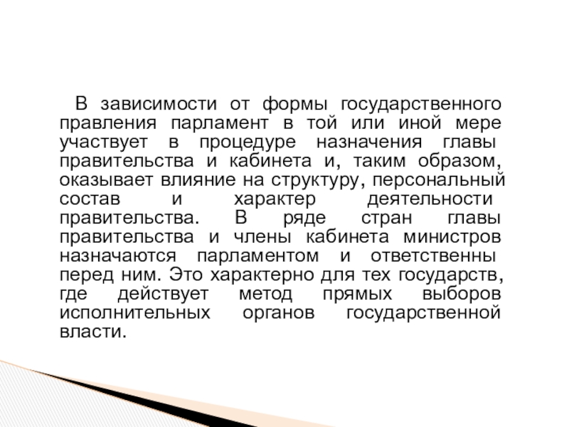и, таким образом, оказывает влияние на структуру, персональный состав и характер деятельности правительства. В ряде стран главы правительства и члены кабинета министров назначаются парламентом и ответственны перед ним. Это характерно для тех государств, где действует метод прямых выборов исполнительных органов государственной власти.