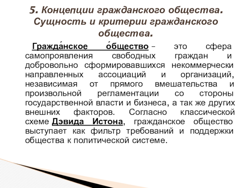ассоциаций и организаций, независимая от прямого вмешательства и произвольной регламентации со стороны государственной власти и бизнеса, а так же других внешних факторов. Согласно классической схеме Дэвида Истона, гражданское общество выступает как фильтр требований и поддержки общества к политической системе.