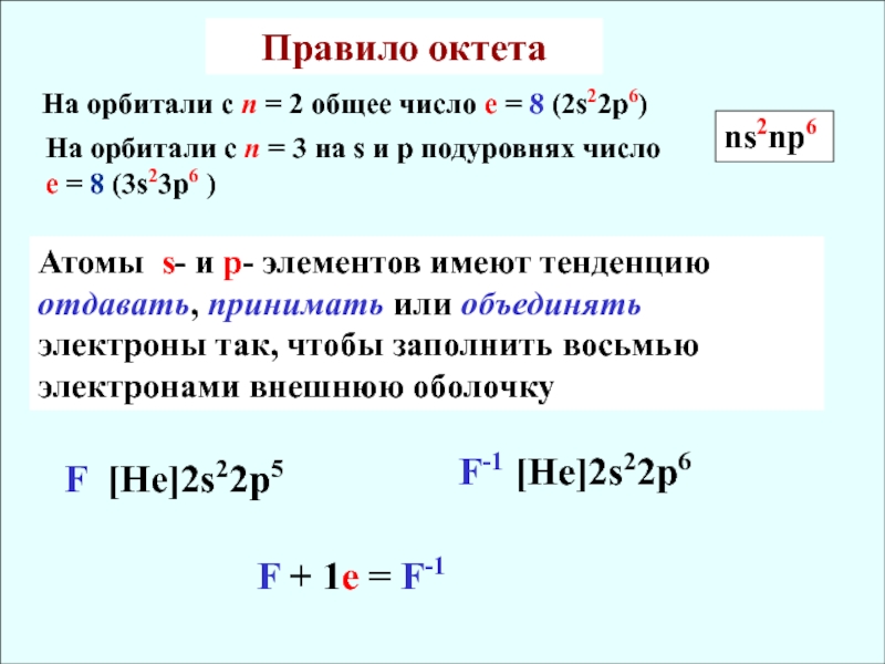 Атомы s- и p- элементов имеют тенденцию отдавать, принимать или объединять электроны так, чтобы заполнить восьмью электронами внешнюю оболочку