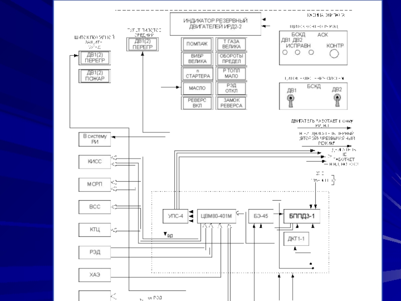 и выдает информацию о работе двигателя в системы КИСС, MCРП, KTЦ и ВСС (данные о расходе топлива), РИ, ВД, НС, СЭС, САС (на табло ВЫКЛЮЧИ ДВ1(2)), а также выдает дискретный сигнал о включении ЧР (чрезвычайного режима) в блок БППД3-1.
