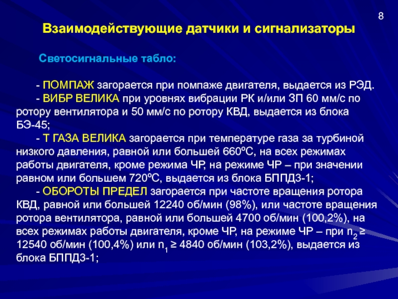 - желтого цвета ВИБР ВЕЛИКА на табло САС и ДВ1(2) ВИБР ВЕЛИКА в КИСС в кадры ДВ/СИГН, СИГН при уровнях вибрации РК и/или ЗП 60 мм/с по ротору вентилятора и 50 мм/с по ротору КВД;