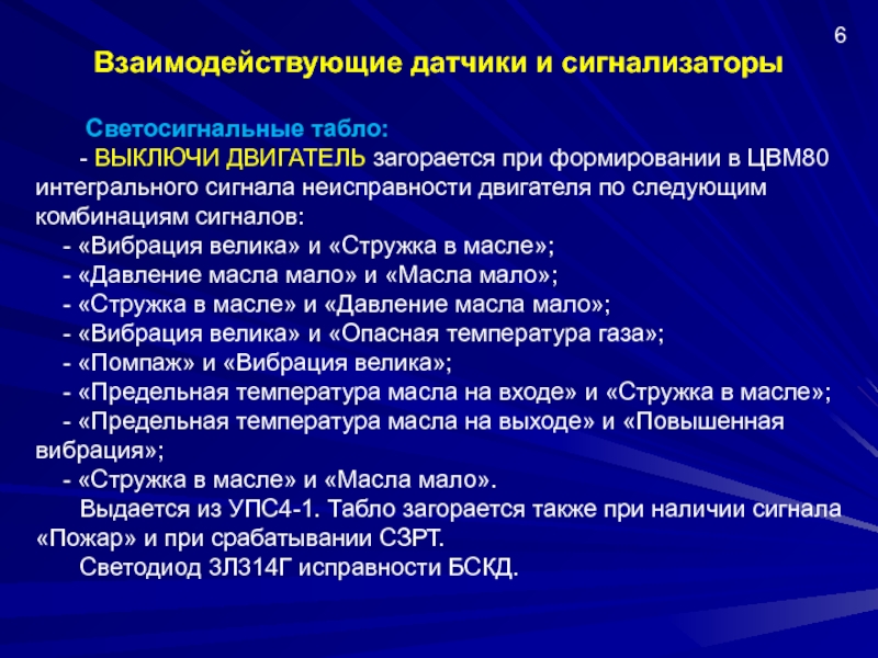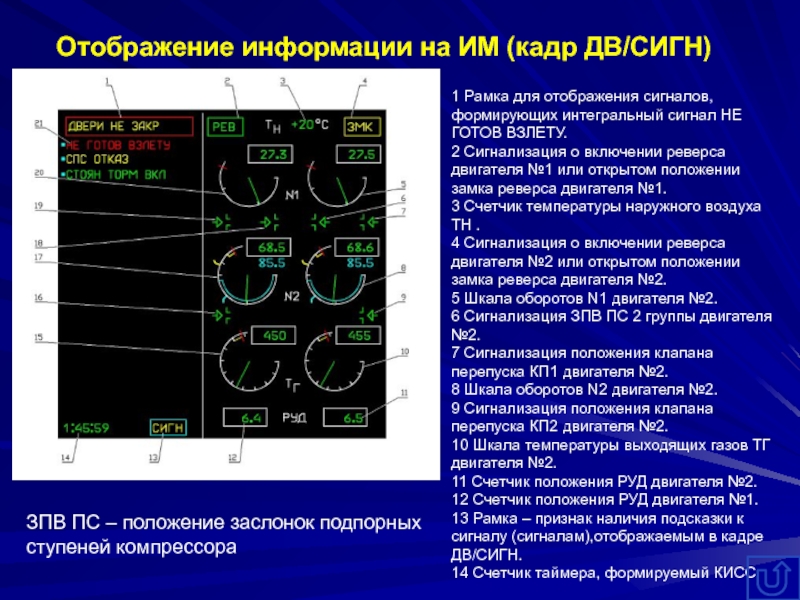 - формирование сигнала на выключение двигателя и выдачу его в СAС на табло красного цвета ВЫКЛЮЧИ ДВ1(2) на пульте пилотов среднем и в КИСС в кадры ДВ/СИГН, СИГН в виде текста ДВ1(2) ВЫКЛЮЧИ ДВИГАТЕЛЬ красного цвета;