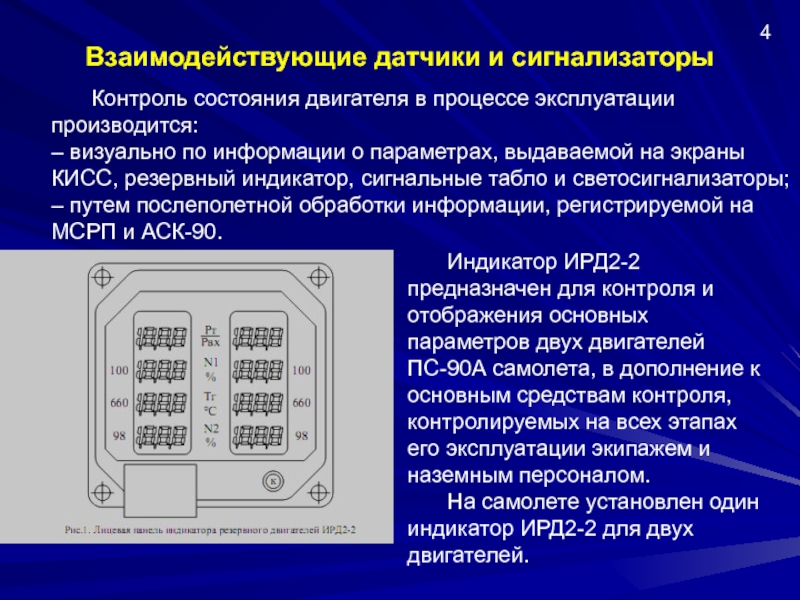 Индикатор представляет собой моноблок с микропроцессорны-ми устройствами, имеющий два жидкокристаллических модуля индикации. ИРД2-2 имеет два независимых канала измерения: для левого и правого двигателей и общий блок питания.