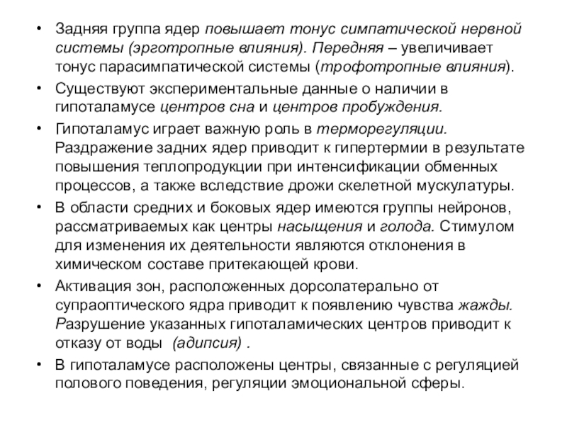 Слайд 13Задняя группа ядер повышает тонус симпатической нервной системы (эрготропные влияния).