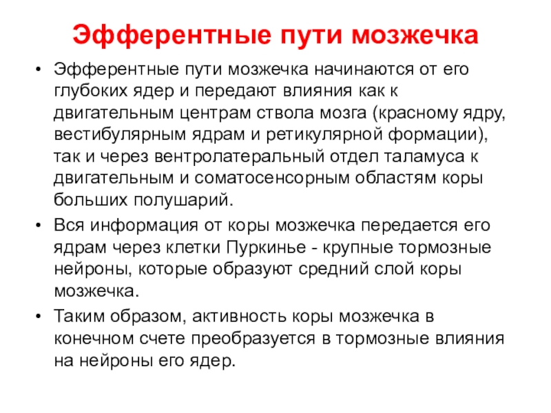 Таким образом, активность коры мозжечка в конечном счете преобразуется в тормозные влияния на нейроны его ядер.