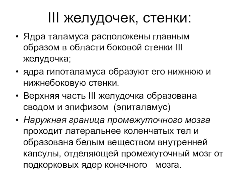 Наружная граница промежуточного мозга проходит латеральнее коленчатых тел и образована белым веществом внутренней капсулы, отделяющей промежуточный мозг от подкорковых ядер конечного мозга.