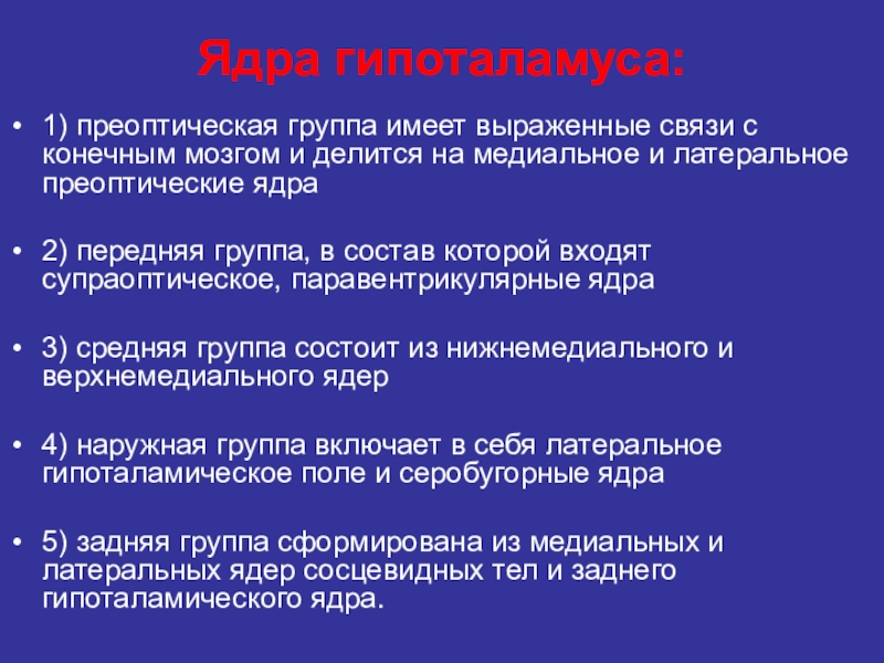 4) наружная группа включает в себя латеральное гипоталамическое поле и серобугорные ядра
