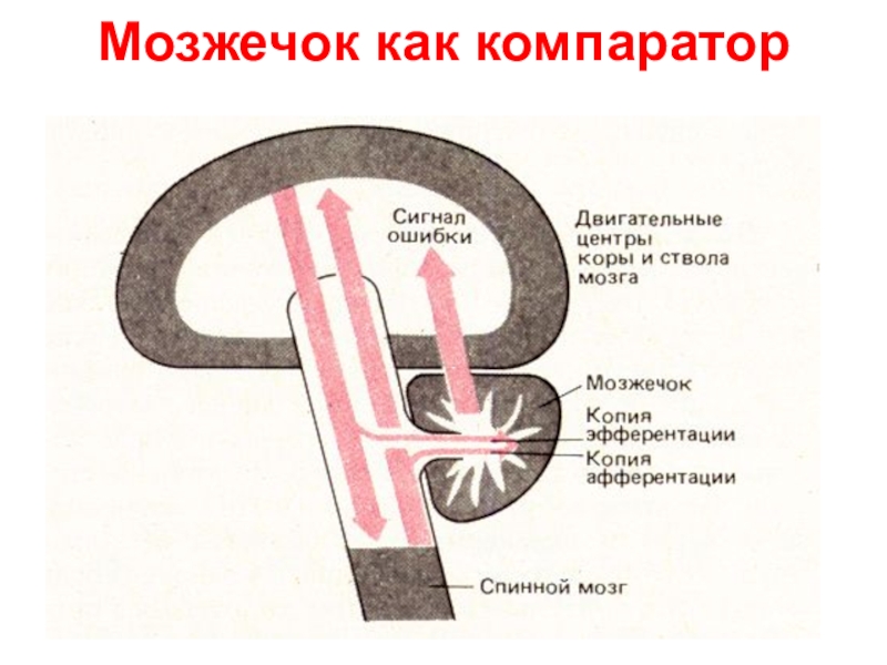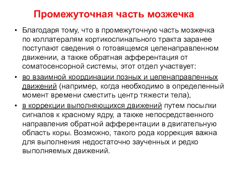 в коррекции выполняющихся движений путем посылки сигналов к красному ядру, а также непосредственного направления обратной афферентации в двигательную область коры. Возможно, такого рода коррекция важна для выполнения недостаточно заученных и редко выполняемых движений.
