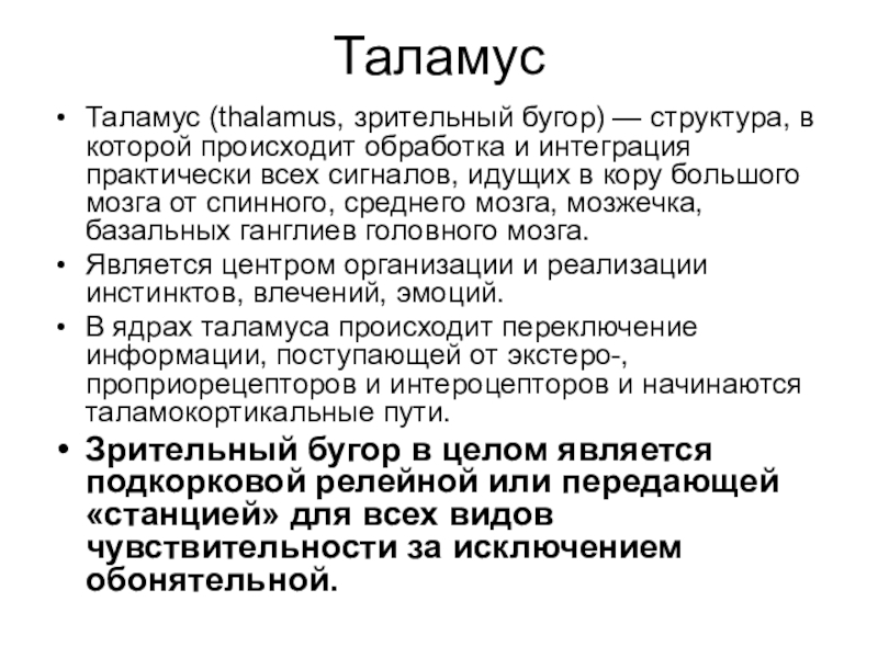Таламус (thalamus, зрительный бугор) — структура, в которой происходит обработка