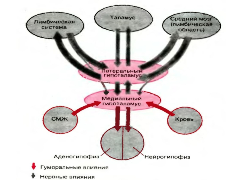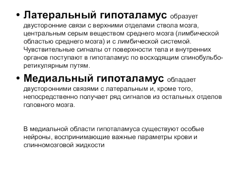 Медиальный гипоталамус обладает двусторонними связями с латеральным и, кроме того, непосредственно получает ряд сигналов из остальных отделов головного мозга.