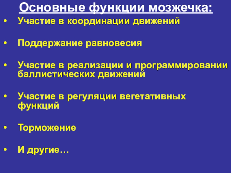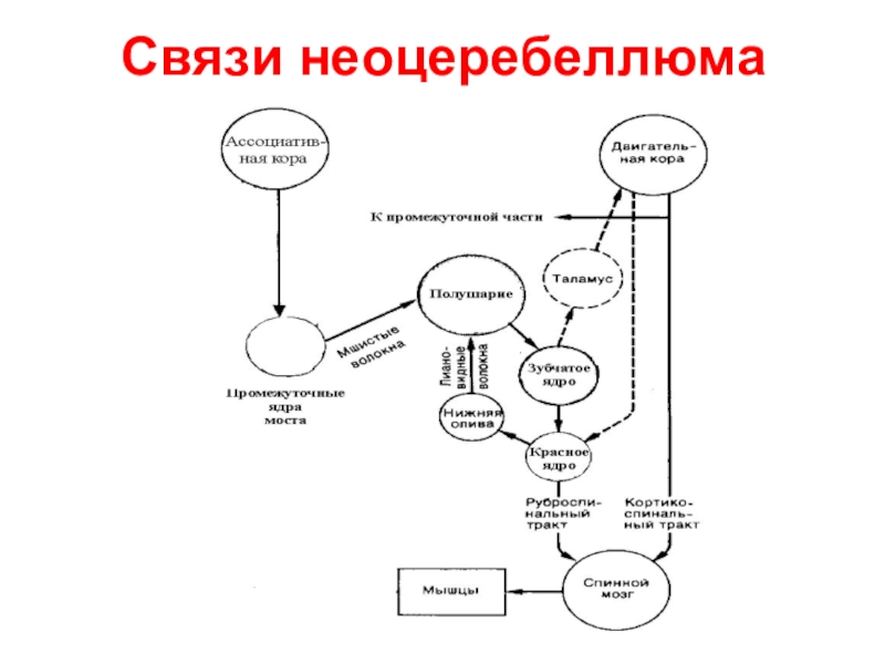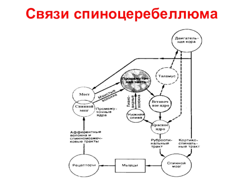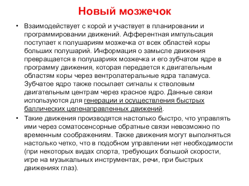 областей коры больших полушарий. Информация о замысле движения превращается в полушариях мозжечка и его зубчатом ядре в программу движения, которая передается к двигательным областям коры через вентролатеральные ядра таламуса. Зубчатое ядро также посылает сигналы к стволовым двигательным центрам через красное ядро. Данные связи используются для генерации и осуществления быстрых баллических целенаправленных движений.