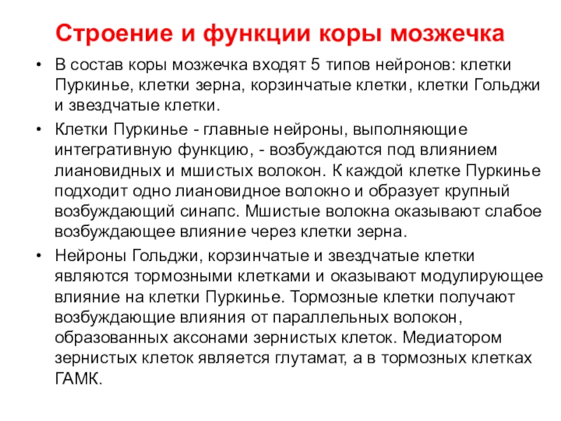 Нейроны Гольджи, корзинчатые и звездчатые клетки являются тормозными клетками и оказывают модулирующее влияние на клетки Пуркинье. Тормозные клетки получают возбуждающие влияния от параллельных волокон, образованных аксонами зернистых клеток. Медиатором зернистых клеток является глутамат, а в тормозных клетках ГАМК.