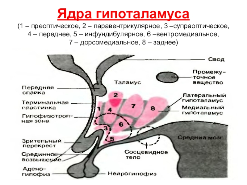 (1 – преоптическое, 2 – паравентрикулярное, 3 –супраоптическое, 4