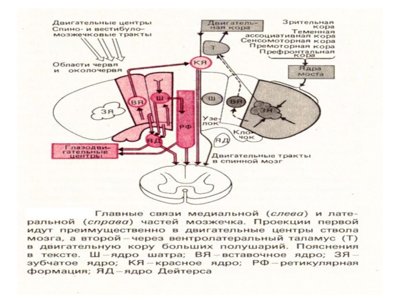 ядру, вестибулярным ядрам и ретикулярной формации), так и через вентролатеральный отдел таламуса к двигательным и соматосенсорным областям коры больших полушарий.