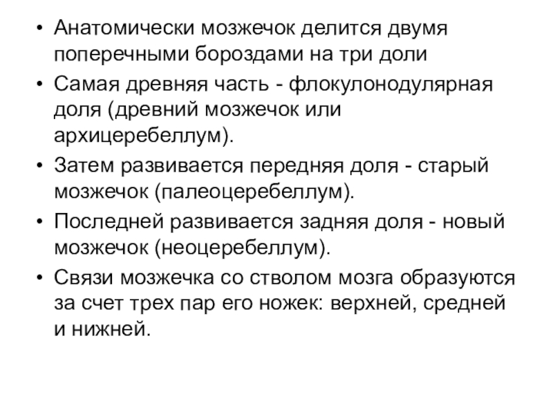 Слайд 18Анатомически мозжечок делится двумя поперечными бороздами на три доли