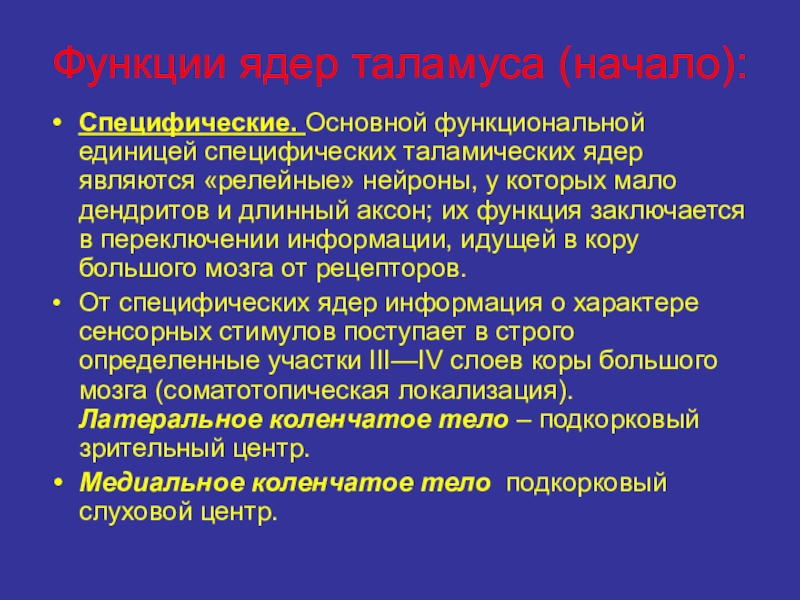 В ядрах таламуса происходит переключение информации, поступающей от экстеро-, проприорецепторов и интероцепторов и начинаются таламокортикальные пути.