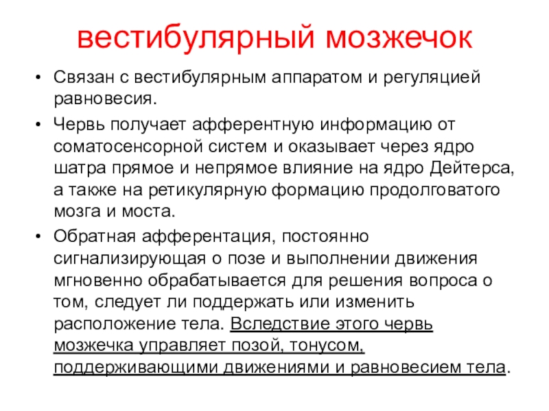 Обратная афферентация, постоянно сигнализирующая о позе и выполнении движения мгновенно обрабатывается для решения вопроса о том, следует ли поддержать или изменить расположение тела. Вследствие этого червь мозжечка управляет позой, тонусом, поддерживающими движениями и равновесием тела.