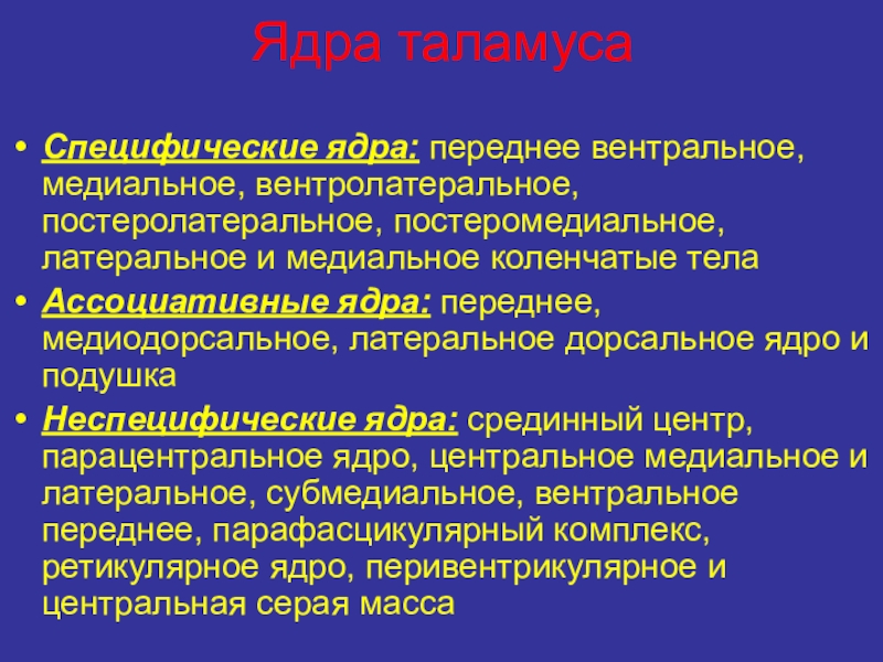 Cпецифические ядра: переднее вентральное, медиальное, вентролатеральное, постеролатеральное, постеромедиальное,