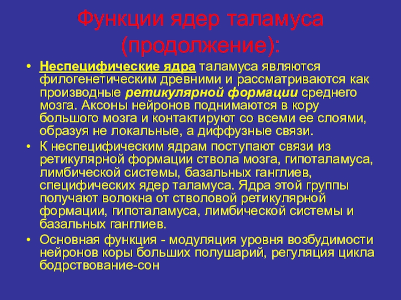 К неспецифическим ядрам поступают связи из ретикулярной формации ствола мозга, гипоталамуса, лимбической системы, базальных ганглиев, специфических ядер таламуса. Ядра этой группы получают волокна от стволовой ретикулярной формации, гипоталамуса, лимбической системы и базальных ганглиев.