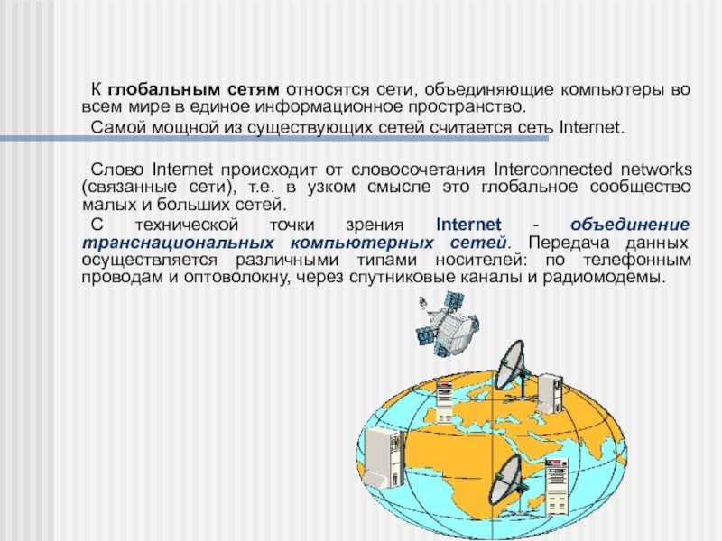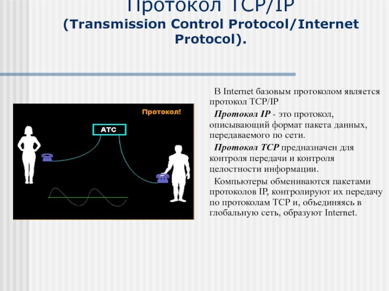 Компьютеры обмениваются пакетами протоколов IP, контролируют их передачу по протоколам ТСР и, объединяясь в глобальную сеть, образуют Internet.