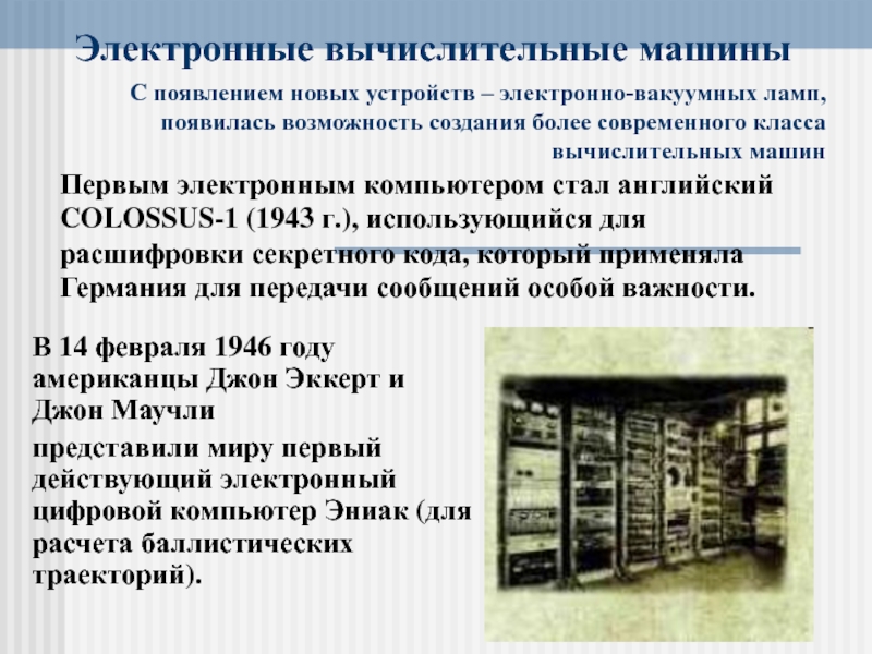 С появлением новых устройств – электронно-вакуумных ламп, появилась возможность создания более современного класса вычислительных машин