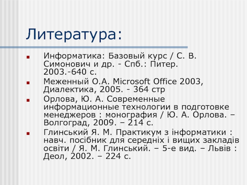 Глинський Я. М. Практикум з інформатики : навч. посібник для середніх і вищих закладів освіти / Я. М. Глинський. – 5-е вид. – Львів : Деол, 2002. – 224 с.