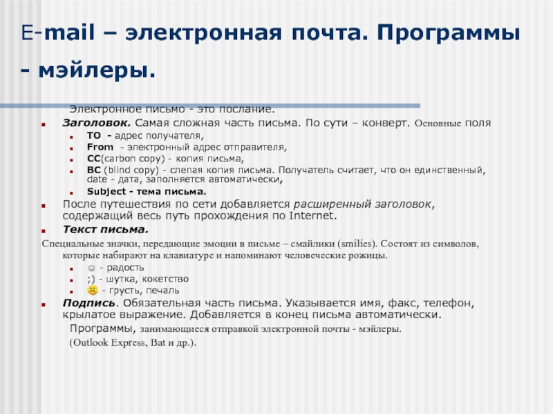 Слайд 56E-mail – электронная почта. Программы - мэйлеры.