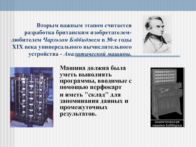 Слайд 10Вторым важным этапом считается разработка британским изобретателем-любителем Чарльзом Бэббиджем в