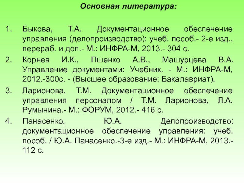 И.К., Пшенко А.В., Машурцева В.А. Управление документами: Учебник. - М.: ИНФРА-М, 2012.-300с. - (Высшее образование: Бакалавриат).