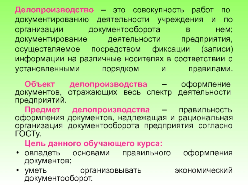 Предмет делопроизводства – правильность оформления документов, надлежащая и рациональная организация документооборота предприятия согласно ГОСТу.